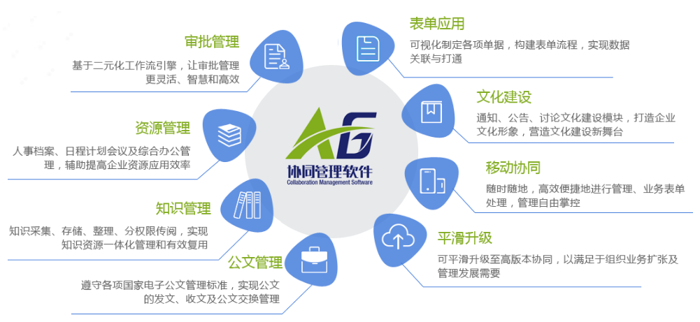 审批管理、资源管理、知识管理、公文管理、表单应用、文化建设、移动协同、平滑升级